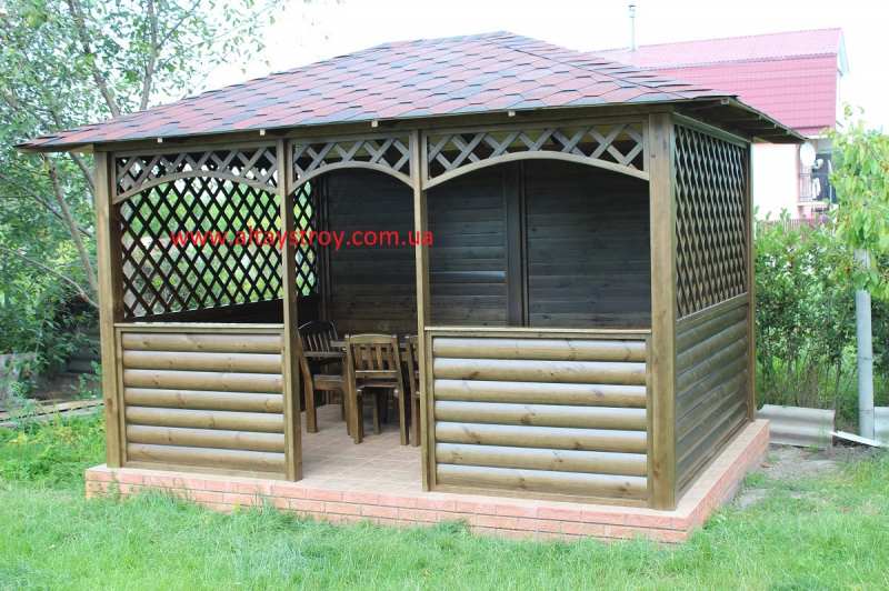 Пол в беседке может быть изготовлен как из дерева, так и из керамической плитки, камня.