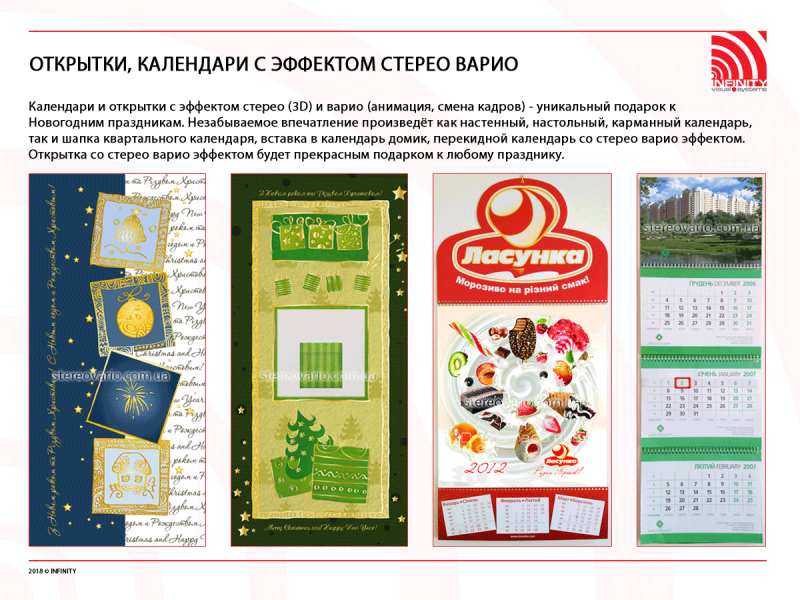 Календарь, открытка со cтерео варио эффектом (3D, анимация, зум, морфинг) привлекают внимание потребителя и заставляют его зафиксировать внимание на рекламируемом продукте. Печать стерео-варио рекламной продукции как на западном, так и на украинском рынке уже стала популярна среди бизнеса в различных областях.