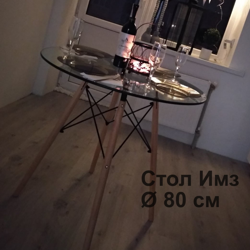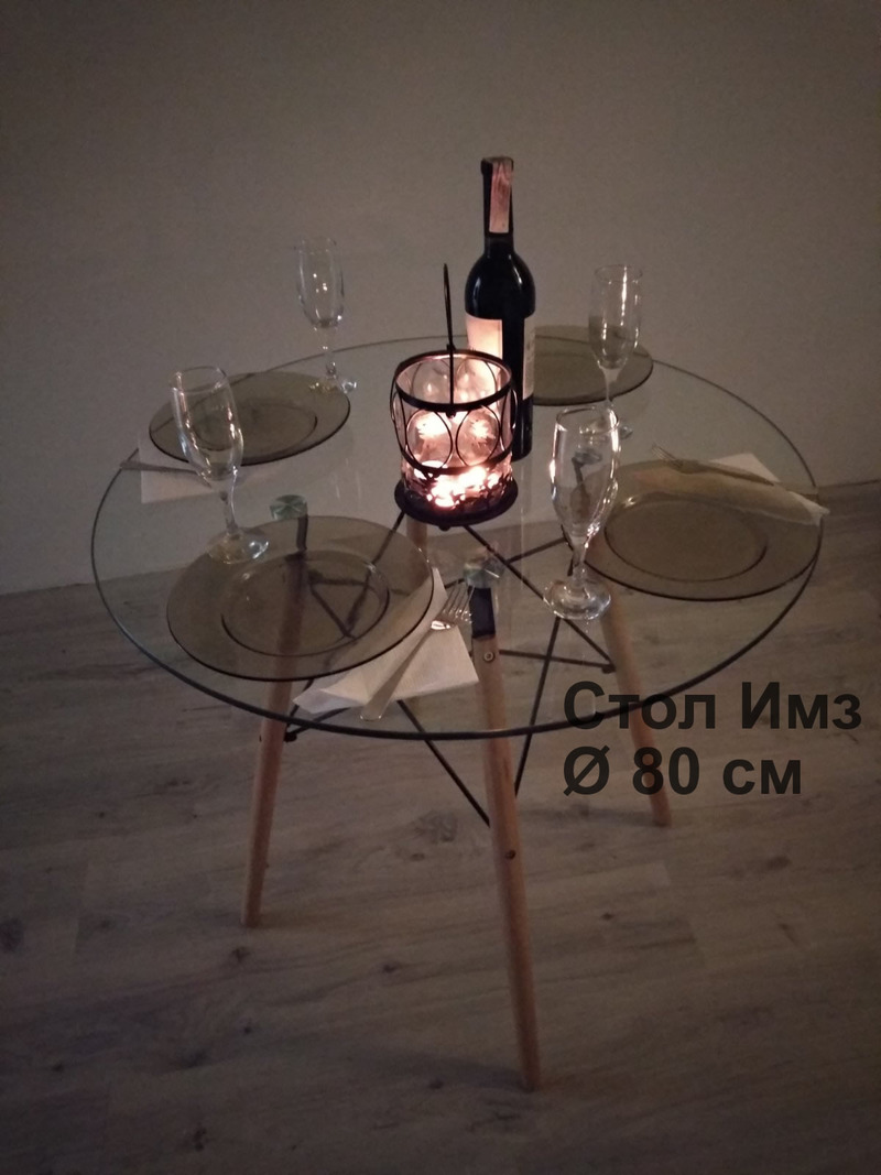 Бесплатно пересылка на отделение курьерской службы. Кухонный обеденный стеклянный стол Имз Стол имеет диаметр 80 см, высоту 73 см. Ножки стола из дерева. |