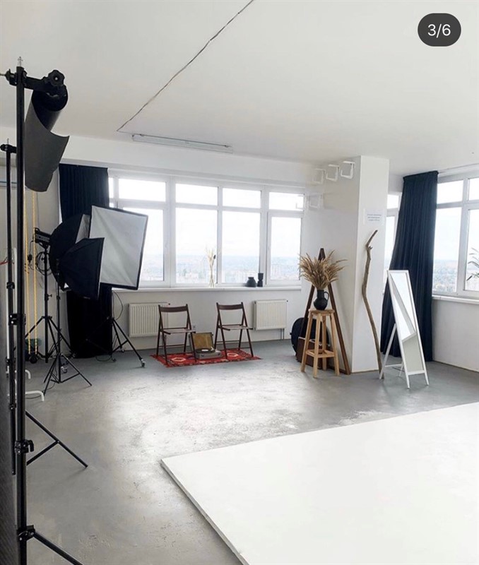 Студия: 4 зала: зал «Тропический душ» с проведённой горячей и холодной водой, зал «Гостиная», зал «Циклорама» с постоянным шикарным естественным освещением и красивыми тенями от оконных рам, гримерная (2 гримёрных стола с профессиональным освещением).