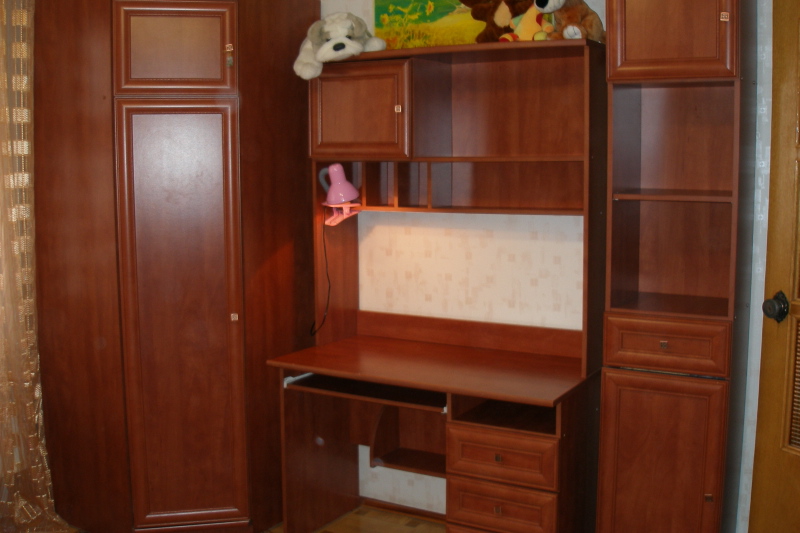 Продам детскую Престиж фирмы Нова г. Тернополь бу в отличном состоянии. Цвет темнокоралловый (ковальдос). Резьба по дереву. Высота 2.13, длина 2.23. Состоит из трех отделений: объемный угловой шкаф (пенал + платяной шкаф) треугольной формы глубина 85 х 85, высота 2.13 с закрытой глубокой антресолью, письменный стол (выдвижное отделение для клавиатуры и открытая полка-подставка для системного блока) с закрытой антресолью для книг, тетрадей сверху и 2 открытыми книжными полками, имеются 3 выдвижных ящика для письменных принадлежностей. Пенал высота 2.13, глубина 35 с тремя открытыми книжными полками, двумя закрытыми антресолями и с выдвижным ящиком для белья. Цена 2000 грн. Самовывоз с Позняков. Инна м.т. 0976429152