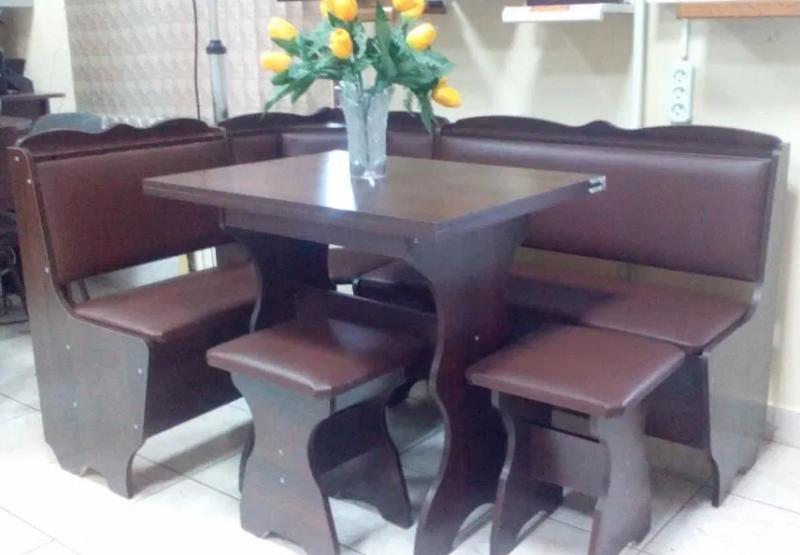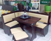 На ваш выбор – 9 различных цветов ДСП и 9 вариантов обивки (кожзам или ткань) – подобрать подходящий по стилю угловой диванчик и кухонный стол из ДСП вовсе не проблема.