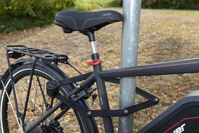 Велосипедный или мопедный складной замок с держателем Fischer, (уровень безопасности 8) Стальные закаленные стержни, покрытые пластиком, включает в себя 2 ключа и крепление ручки с помощью прорезиненных нескользящих полосок на липучке или с помощью винтов на держателе для бутылок. Компактскладной замок с держателем (уровень безопасности 8) непревзойдённый дизайн и высокий уровень безопасности в сочетании с практической эксплуатацией. Особенно прост в эксплуатации - даже в темноте. Высокая защита от воров. Характеристики: Конструкция из прочных стальных пластин Специальный цилиндровый механизм Влагозащитное покрытие Держатель велозамка на раму или подседельную трубу 2 стальных ключа Цвет: черный Длина: 85 см Вес: 856 г
