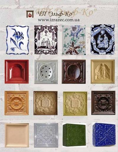 Керамические изразцы (кафель) предназначены для облицовки и кладки лицевых поверхностей отопительных бытовых печей, кухонных плит и каминов. Конструкция изразцов отличается прочностью, долговечностью, надежно крепится в кирпичной кладке. Лицевая поверхность изразцов имеет рельефный декор, покрытый цветной глазурью двух или трех цветов, изображающей элементы растительного орнамента.