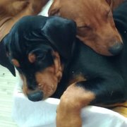 Двомісячні цуценята рудий хопчик та чорняво-підпала дівчинка породи німецький пінчер стандартний. Доросла собака 45 см у холці, це менше добермана але більше карликового пінчера. Вакцинації зроблені. Документи щенячий родовід готові. Порода короткошерстна, ладна до дітей. Батьки Чемпіони України. *** Оля - 0674968647 |