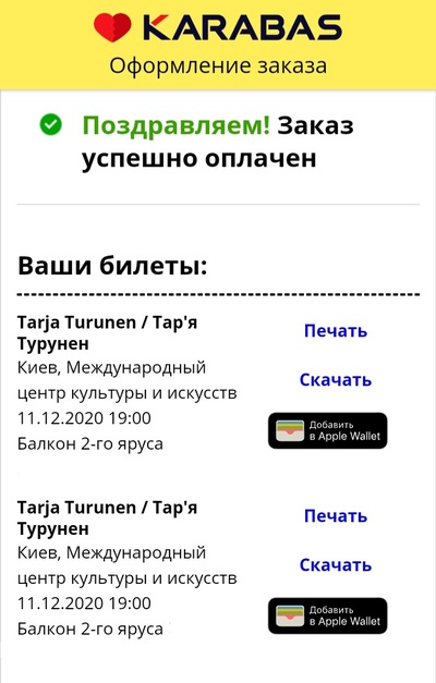 Предлагаю 2 билета на концерт экс солистки групы Nightwish Тарьи Турунен. Билеты электронные так как карантин и нету возможности купить бумажные, но их можно распечатать на принтере или пройти по QR коду. Продаю так как поменялись планы. Покупал два за 900 грн. Отдам 2 за 500 с возможностью небольшого торга реальному покупателю. Процес продажи: я вам первый скину 1 билет на вайбер или почту вы мне 200 грн на карту далее я скидываю 2 билет вы мне остальную сумму) Дзвоните, пишите!) 066 798 66 37 |