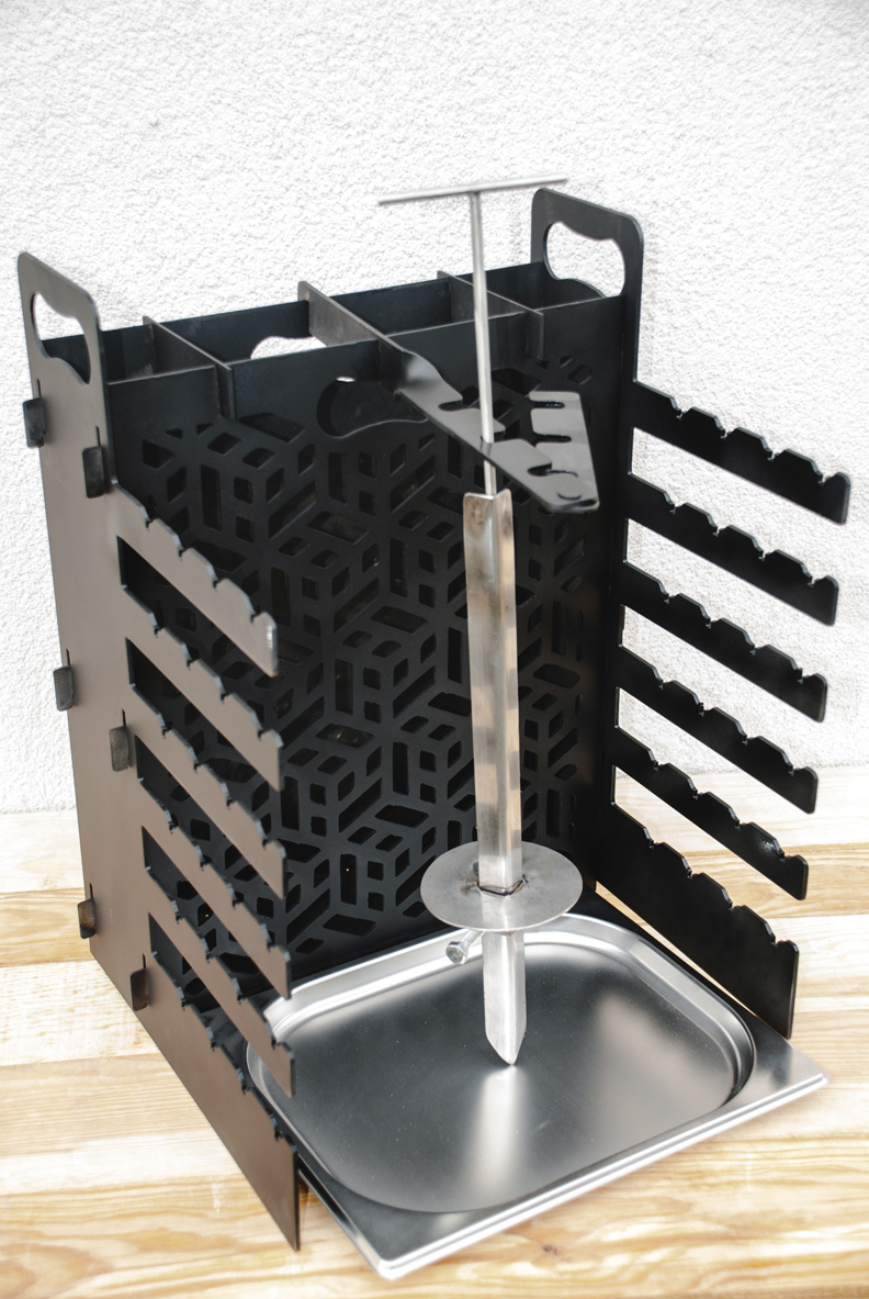 Вертикальный мангал изготавливается из металла толщиной в 3 мм. Это толстостенный металл, что делает изделие долговечным. Резка выполняется с помощью плазменного станка с ЧПУ. Конечная конструкция надежна и прочна.