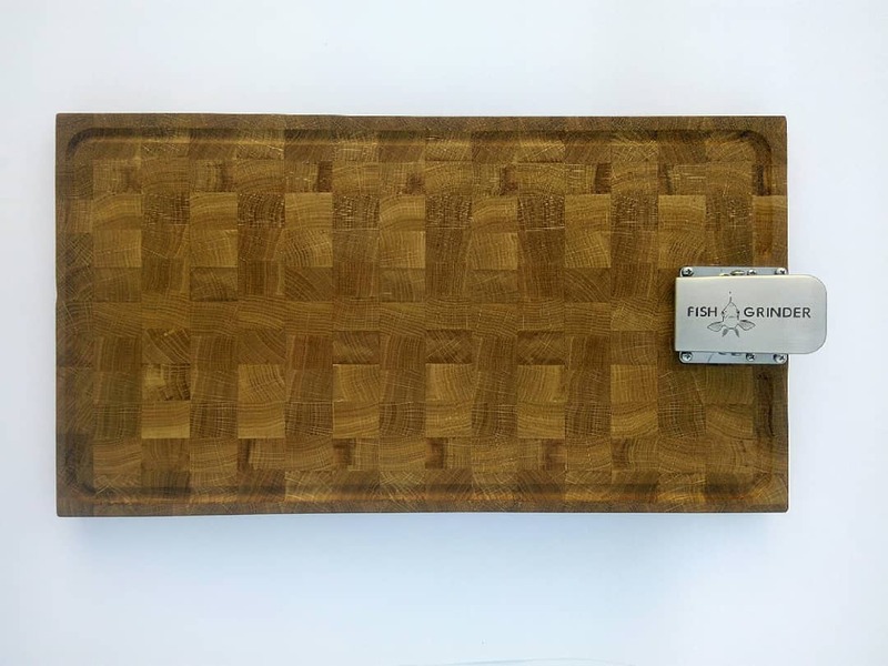 Дубовая торцевая доска для чистки рыбы с зажимом для хвоста. Материал: дуб и нержавейка. Дерево обработано специальной пропиткой. Размер - 550х 300 х 35 мм. На нижней части - антискользящие пятки из пищевой резины, диаметром 30 мм. http://fish-grinder.in.ua |