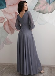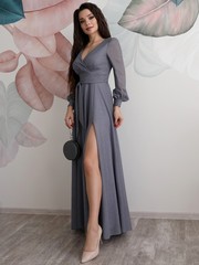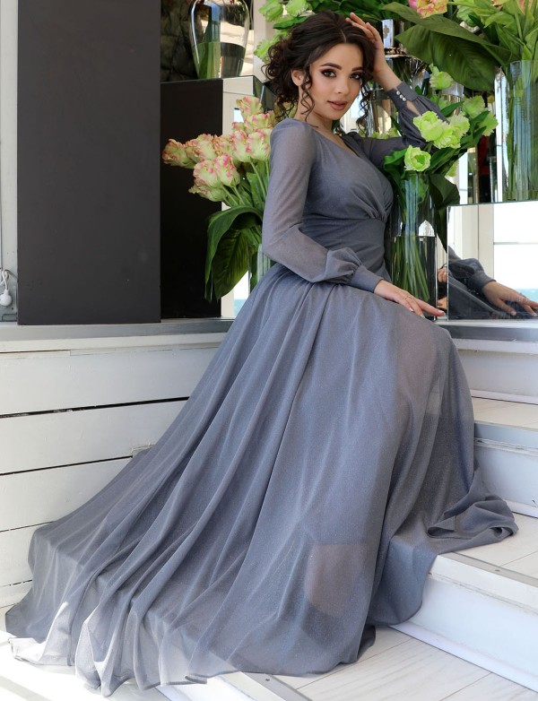 Шикарное блестящее платье в пол. Красивый, нарядный шифон струится и переливается. Чаши лифа средней плотности, v образный вырез декольте нежно приоткрывает грудь, топ платья драпирован. От талии вниз, плавно спадая по бёдрам, струится приятный материал. Блестящий поясок можно завязать впереди или сзади. Свободные полупрозрачные рукава добавляют платью нежности и женственности. Платье сверкает и переливается тысячами блёсток. При дневном освещении выглядит празднично и нарядно, а в вечерние часы магическая сила наряда удваивается. Лучшая фабрика Украины рада предложить достойное, изысканное платье для незабываемого торжества!