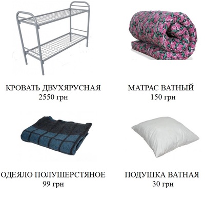 Кровати двухъярусные металлические 190*70 см по 2550 грн. Матрасы ватные 190*70 см по 150 грн. Одеяла полушерсть 140*205 см по 99 грн. Подушки ватные 50*50 см по 30 грн. Комплект постельного белья полуторный по 159 грн. Другие размеры и материалы Опт. Производство. Опт от 5000 грн. Склад Киев. Отправка по Украине. Евгений Николаевич. 098-698-81-96 095-262-78-78 |