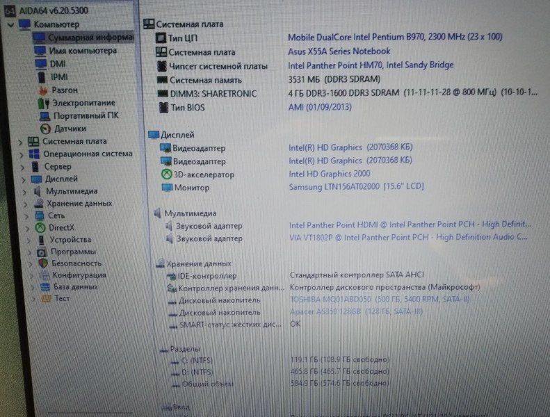 Ноутбук ASUS X55A Black Внешне состояние хорошее. Технически все работает отлично Стоит SSD и HDD Состояние батареи SSD и HDD есть на фото. Комплект ноутбук батарея зарядка. Цена без торга! Диагональ экрана 15.6" (1366x768) WXGA HD Процессор Intel Pentium B970 (2.30 ГГц) Объем оперативной памяти 4 ГБ Объём SSD 120 ГБ Объём HDD 500 ГБ Видеокарта Intel HD Graphics Дополнительные возможности Веб-камера 0.3 Мп Встроенный микрофон Сетевые адаптеры Wi-Fi 802.11 b/g/n Bluetooth Gigabit Ethernet Разъемы и порты ввода-вывода 1 порт USB 3.0, 1 порт USB 2.0, VGA, HDMI, LAN (RJ-45), микрофонный вход, выход на наушники, кард-ридер Батарея Литий-ионная, 6-ячеечная Габариты 374 x 265 x 45 мм Вес 2.6 кг |