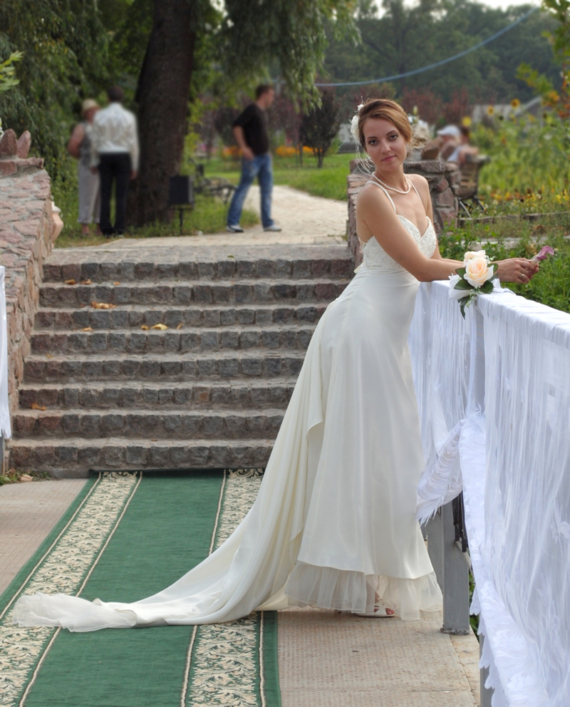 Продам очень элегантное свадебное платье цвета слоновой кости. Замечательно подчёркивает фигуру с шикарным шлейфом, который при необходимости можно легко носить на руке. Бюст и низ от спины до пола расшит очень изысканной вышивкой и камнями. Спина открыта, на тонкой шнуровке.Размер 46, рост 176 см.В отличном состоянии, после химчистки. В подарок украшение ручной работы на голову (покупалось за 300грн). 097-976-10-49 Анна |