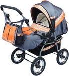 Достоинства: Хорошее соотношение цены и качества. Коляска большая (длиннее и шире обычных колясок), удобная, всепроходимая (снег, лес,песок-запросто) надежная.