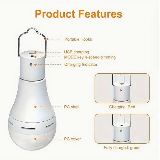 Зручний у використанні перезарядний світлодіодний світильник з гачком, може бути легко підвішений будь-де або покладений в будь-який кишеню рюкзака, може бути заряджений будь-яким Android USB, час зарядки становить 3-5 годин, індикатор світиться червоним під час зарядки, зеленим - коли повністю заряджений, є необхідною аварійною лампочкою для випадків відключення електроенергії.