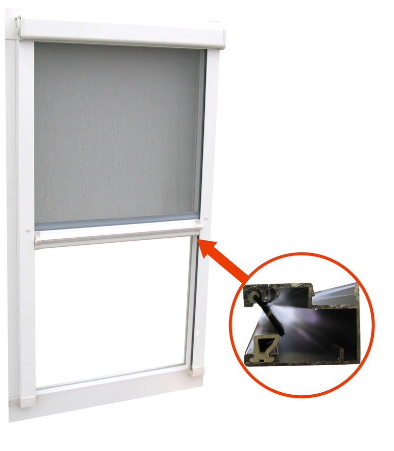 Противомоскитная сетка наматывается в виде рулончика на вал, расположенный вверху окна и закрытый