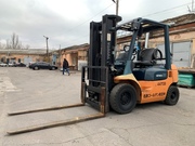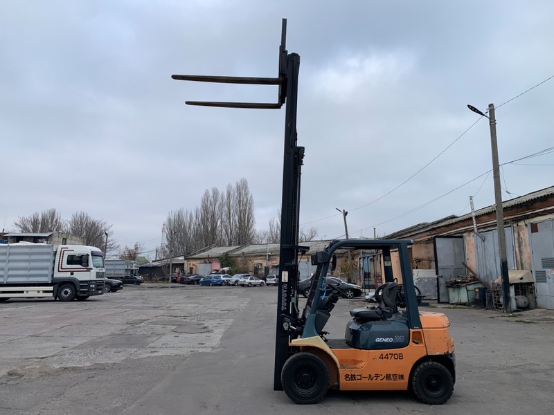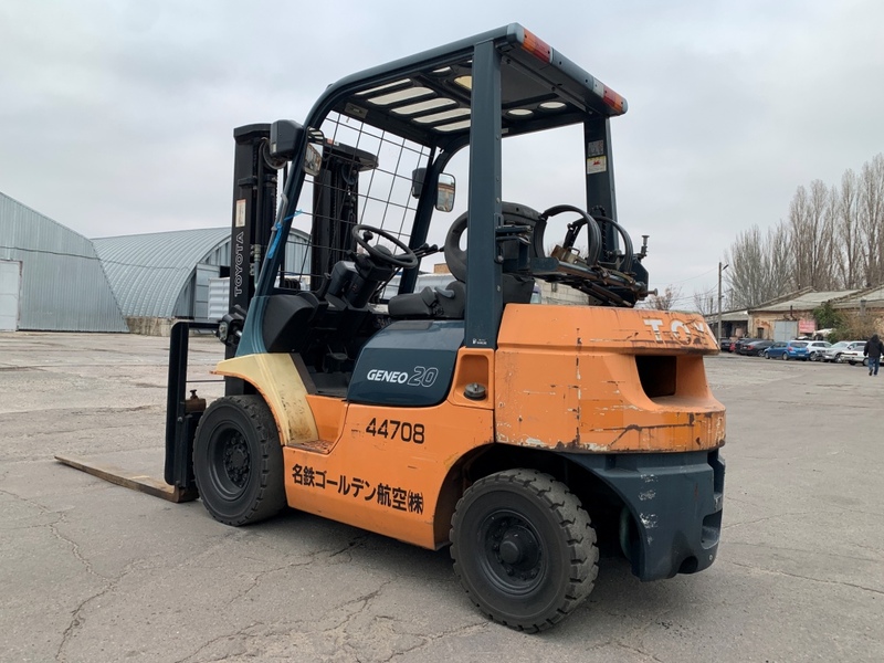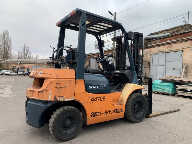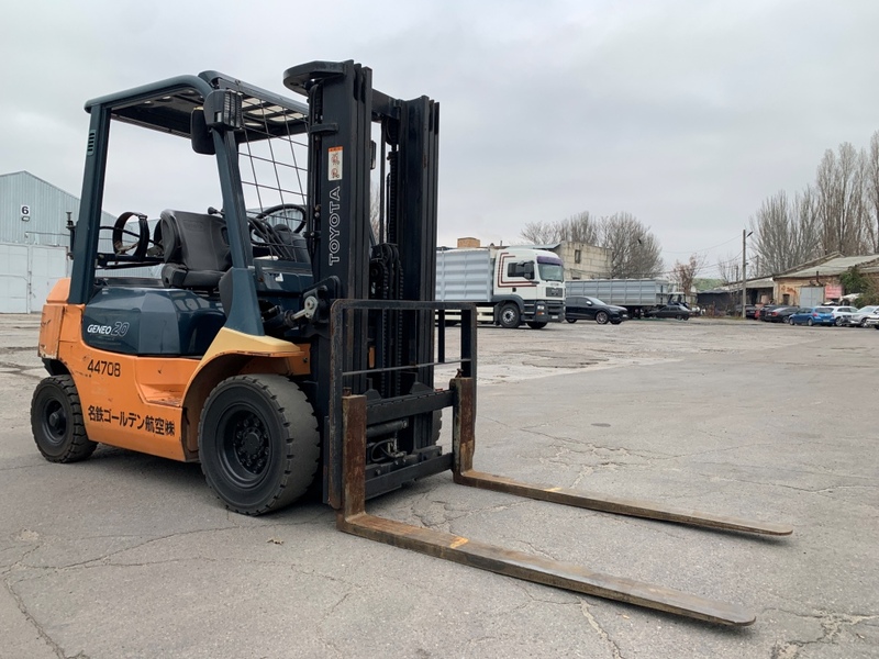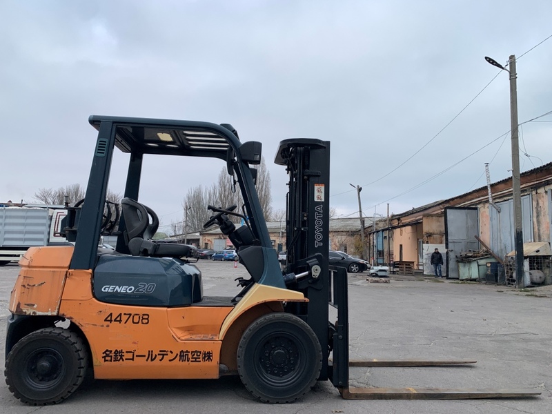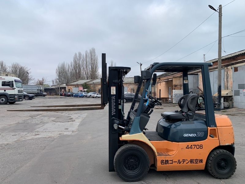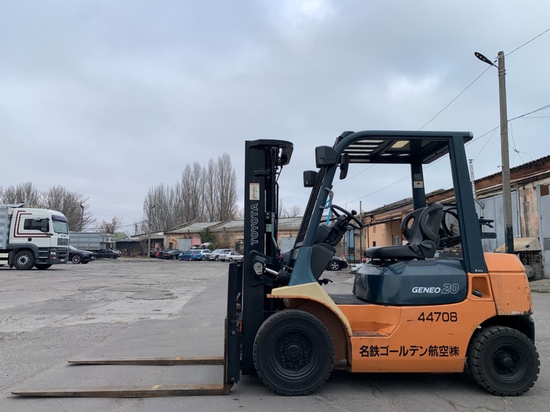 Автонавантажувач вилковий Toyota, вагонник, з бічним зміщенням. Напрацювання 5524 мотогодин. 2004 року випуску. Модель 02-7FG20 . Номiнальна вантажопідйомність 2 тонни. Максимальна висота підйому вантажу 4.3 метри. Щогла трьохсекційна (triplex/триплекс) у якій вила піднімаються незалежно від секцій щогли (з вільним ходом/вагонник/контейнерного типу). Двигун газ-бензиновий, з заводським газовим обладнанням, завдяки чому автонавантажувач у теплу пору року можє запускатись вiдразу на газу, без прогріву системи на бензині. Коробка перемикання передач надiйна i найпоширенiша на данний час - гiдромеханiка (автоматична із гідротрансформатором). Обладнаний сучасним економічним двигуном Toyota 5K. 4-циліндровий, робочим об'ємом 1.5 літра і потужністю 35 к. с. який славиться своєю надійністю і невибагливістю і без особливих змін встановлюється на автонавантажувачах по сьогоднішній день і головне ремонтопридатний. Колеса 12 діаметра на ведучiй осі, що покращує прохідність автонавантажувача і збільшує його кліренс. Встановлено каретку бічного зміщення (side-shift), яка дозволяє зміщувати вантаж на вилах вліво та право на 10 см у кожну сторону, що суттєво прискорює процес роботи та робить його безпечнішим або ж на цю секцію можна встановити навісне обладнання таке як ковш.