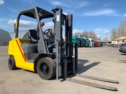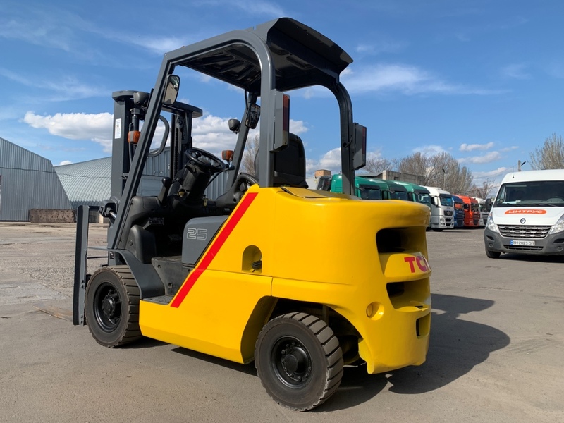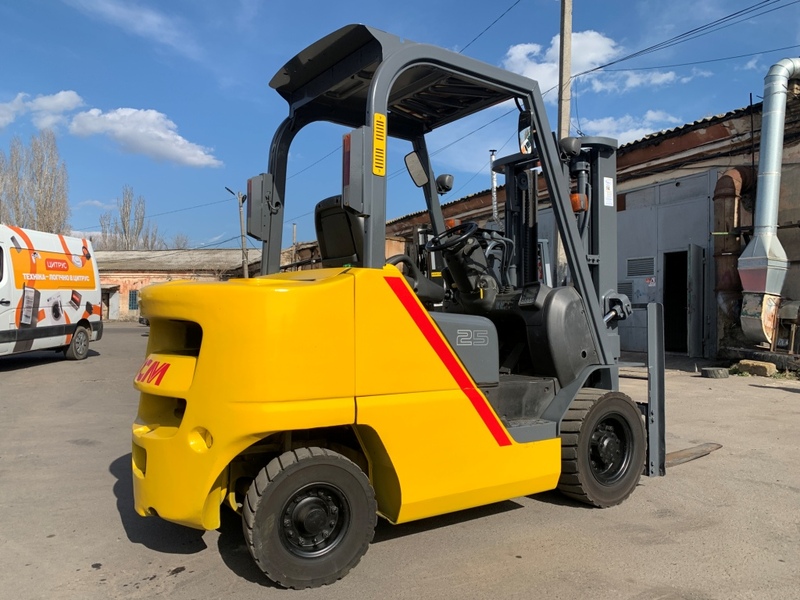 Вилочний автонавантажувач TCM (Nissan), 2017 року, з напрацюванням 7706 м/год. Модель: FHGE25T15. Номiнальна вантажопідйомність 2.5 тонни, при центрі ваги 0.5 метри. Максимальна висота підйому вантажу 3 метри. Щогла двохсекційна (duplex) яка не втрачає вантажопідйомності при висоті підйому. Двигун бензиновий. Коробка перемикання передач надiйна i найпоширенiша на данний час - гiдромеханiка (автоматична із гідротрансформатором). Обладнаний сучасним економічним інжекторним двигуном Nissan K25. 4-циліндровий, робочим об'ємом 2.5 літра і потужністю 54 к. с. який славиться своєю надійністю і невибагливістю і без особливих змін встановлюється на автонавантажувачах по сьогоднішній день і головне ремонтопридатний. Управління гідравлікою здійснюється простою і перевіреною часом системою - важелями. Колеса 12 діаметра на ведучiй осі, що покращує прохідність автонавантажувача і збільшує його кліренс.