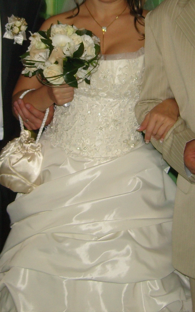 Модель свадебного платья - Барокко, куплено в салоне. Не венчанное. Цвет - слоновая кость(айвори),край платья и корсет обшит кружевом, ручная вышивка бисером. Сзади по корсету молния и шнуровка. (хорошо подчеркивает область декольте) Очень удобное! Есть подъюбник с кольцами. ТОРГ ))) |
