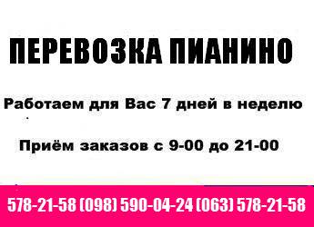 Если Вам нужно перевезти музыкальные инструменты (пианино, рояли), то Вам следует просто позвонить нам и заказать перевозку. Мы возим эти инструменты Вот Уже 20 лет. У Нас работают только Профессиональные Грузчики. Весь транспорт оборудованн для перевозки мебели. Цены Договорные. У Нас Вы можете заказать не только перевозку пианино, рояля. Наша Компания осуществляет перевозку: Любой Мебели, Домашних вещей, Сейфов, Любого оборудования, Бытовой техники, др. грузов. Квартирные. Офисные. Дачные. Перевезем Все! Мы Сделаем Все За Вас. Для Заказа Работ Звоните По Телефонам. 578- 21- 58 (098) 590- 04- 24 (063) 578- 21- 58 |