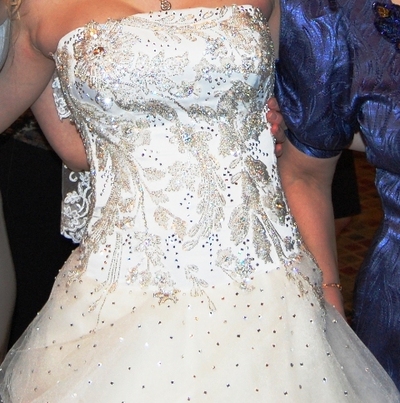 Продам шикарное Свадебное платье цвета Айвори купленое за границой.Размер 42-48 рост 170-176см.Корсет платья расшит стразами, бисером, блестками.Очень качественное оформление все стразы очень яркие и чистые ...разбросаны по юбке платья а корсет расшит густо паетками и стразами. На корсете молния и шнуровка.В комплекте с платьем предлагаю кружевную Болеро и кольца под юбку.Платье одевалось 1 раз, невенчано |