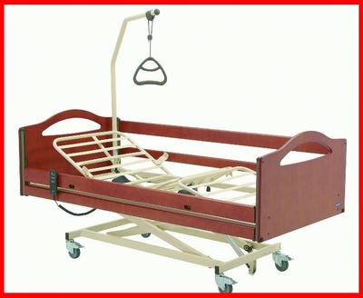 Медицинская кровать с электроприводом на колесах оснащена электромоторами, ложем из закаленной стали, надкроватной трапецией и поручнями. С помощью пульта возможно изменять высоту подъема головной и ножной секций, угол наклона головного и ножного концов, а также регулировать высоту кровати.