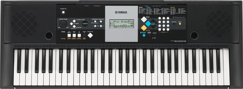 Синтезатор YAMAHA PSR-E223 - обновлённая версия синтезатора YAMAHA PSR-E213, пассивная клавиатура синтезаторного типа, 61 полноразмерная клавиша, 375 тембрами, включая стерео семпл рояля, 361 XGlite тембр, 12 наборов ударных и набор звуковых эффектов, имеет 100 стилей аккомпанемента и 102 встроенные композиции.